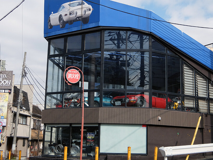 国産ビンテージカーをレストアする有名店には赤いトヨタ2000GTと初代セリカが並んでいました。