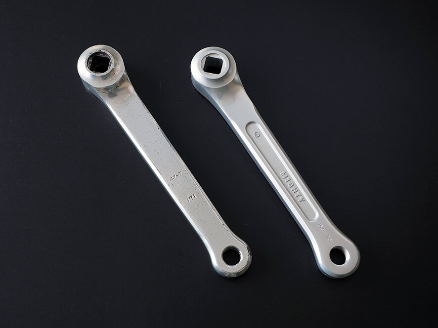 初期のマイティクランクは5アーム部分の肉抜きが穴あき形状ではありませんでしたが、後にOEM供給された前田工業(サンツアー)シュパーブクランク同様に穴あき加工されて面取りの仕上げが綺麗になります。