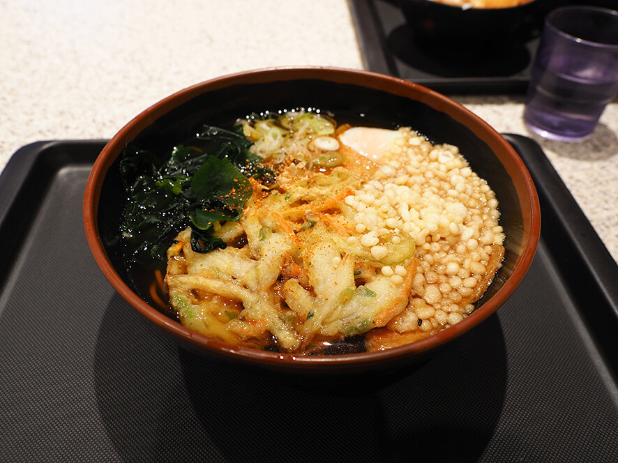 天かす、わかめ、油揚げ、生卵、カニカマ、かき揚げ入りの豪華なそばを美味しくいただきました。