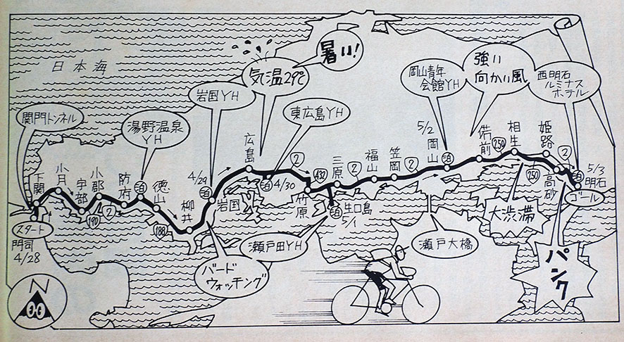 この時宿泊した「湯野温泉」「岩国」「東広島」「瀬戸田」「岡山青年会館」の各ユースホステルは全て閉館しました。そして、この旅で出会ったサイクルツーリストはGWの6日間にも関わらずたったの3人だけ。寂しいなぁ…。