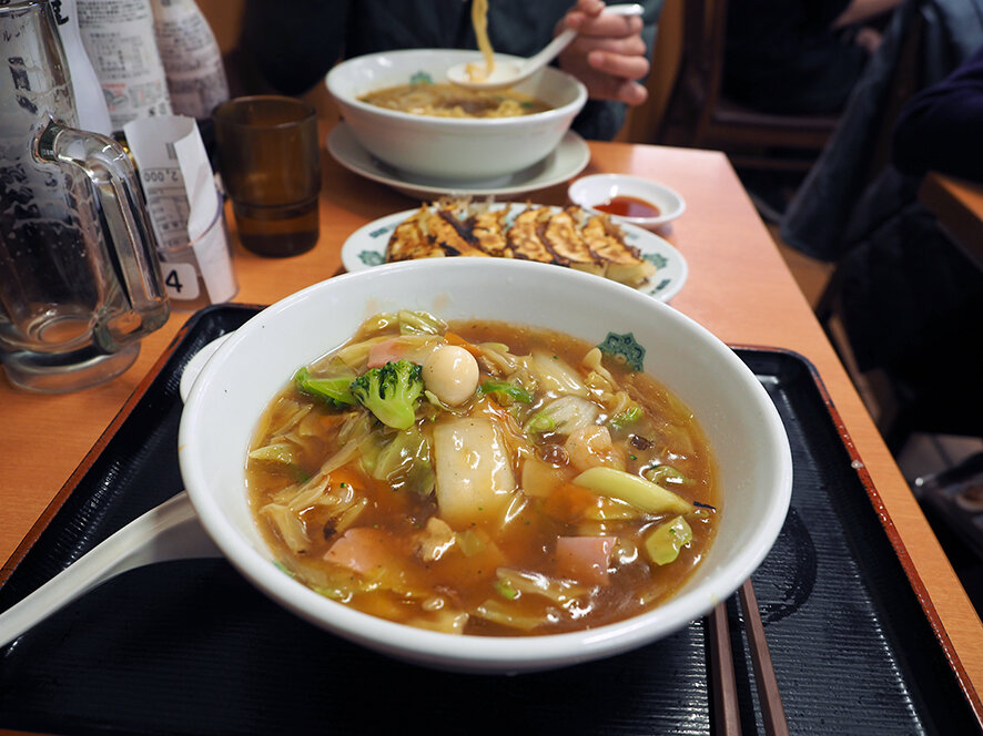 息子は味噌ラーメンに餃子、私は五目あんかけラーメンに生ビール!!