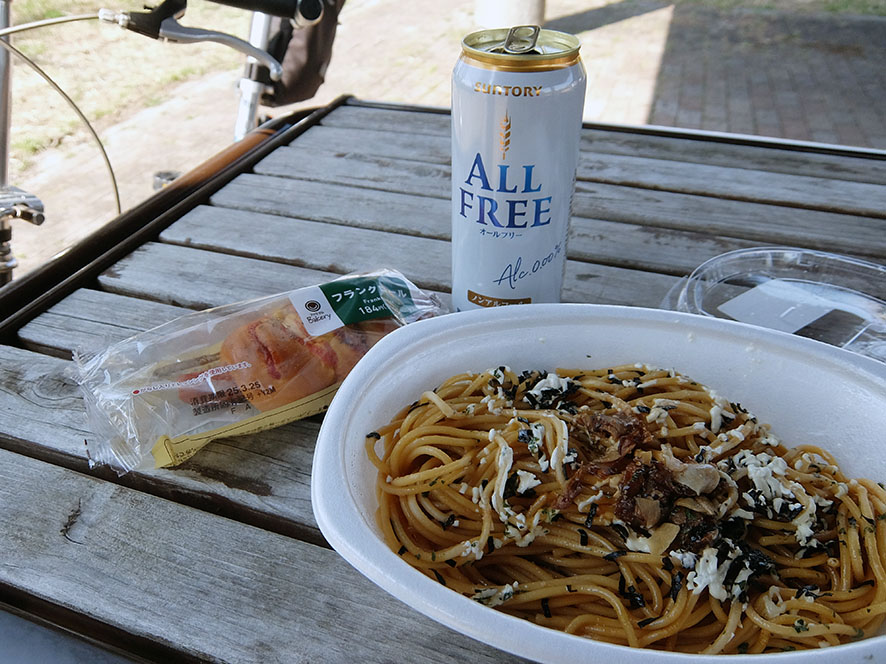 14時近くですが、ようやく昼ごはんです。我慢できずにノンアル飲料付き(苦笑)。