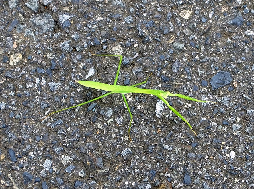 激戦を生き抜いて成長したカマキリが道をノソノソ。
