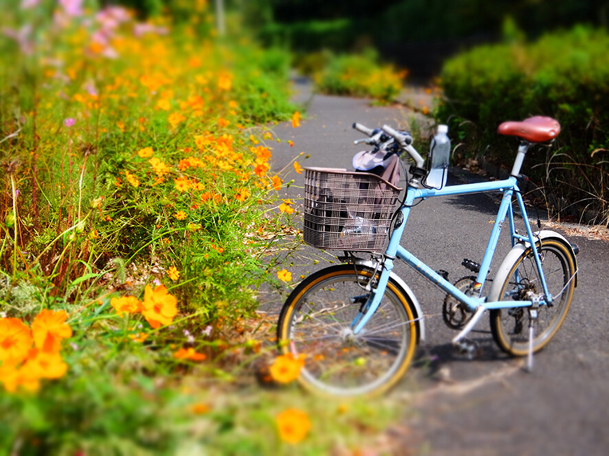 新ミニベロ、人気色は売り切れ状態で残った色から選ぶしかなかったので渋いカラーになってしまいました。日差しのもとでは高級感あるのですが、日陰だと今までより目立ちません。ちょっと失敗したかな(汗)。