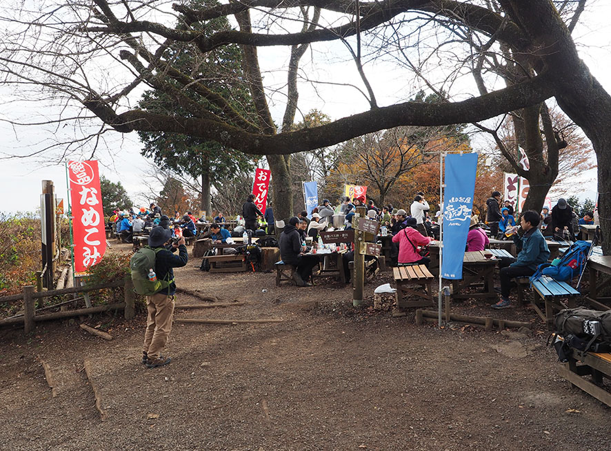 昼時で大賑わいの小仏城山に到着。さすがに名物のかき氷は無くなり、暖かなぜんざいやなめこ汁の幟が目立っていました。
