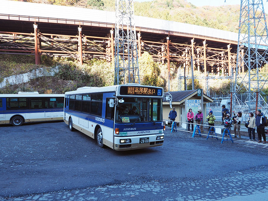 13~15時台は、20分おきにバスが出ていますし、2台体制でやってくるので、余裕を持ってバスに乗車。JRの高尾駅まで運んでくれます。