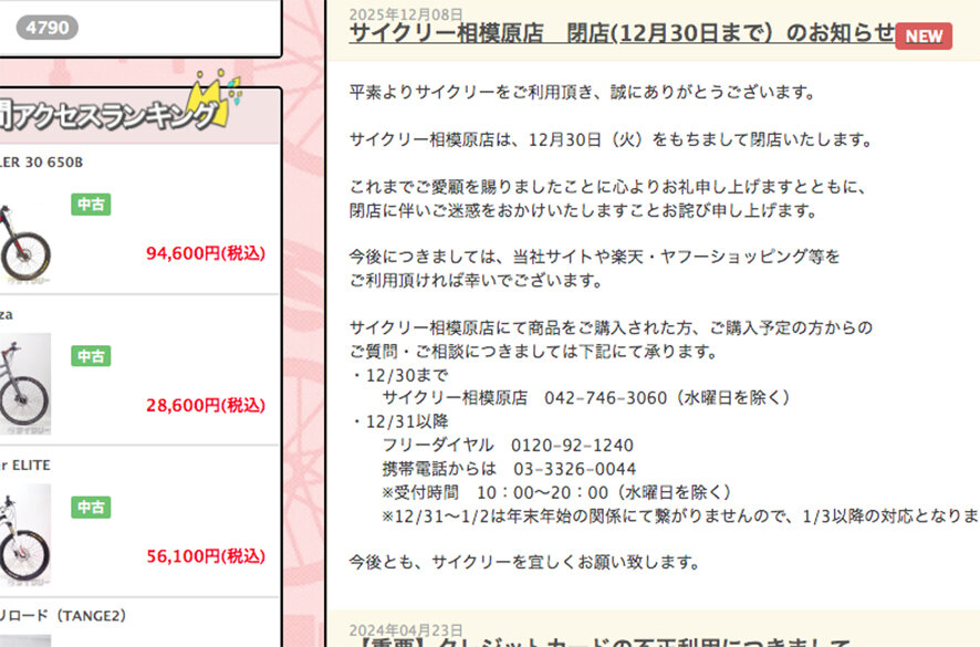 中古販売店としては老舗的な扱いだった「サイクリー相模原店」も12月30日で閉店。