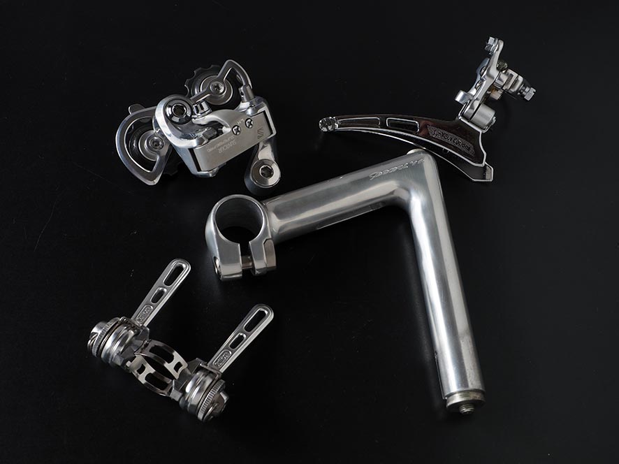 初代とは大きくデザインを変えた、当時のエアロブームを追求したようなデザイン。全体をバフ仕上げとすることでピカピカに輝いていました。悲しいかな手入れを怠ると、すぐに汚くなってしまうのは、ツーリスト御用達のTAのクランクやチェーンリングとも似ています。